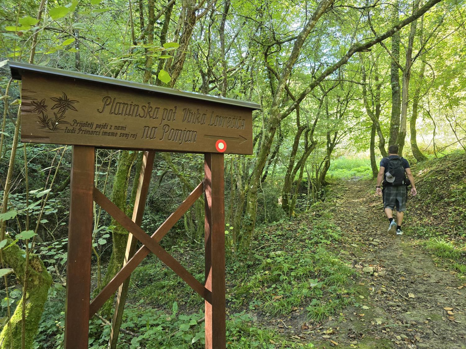Pot nadaljujemo proti levi skozi gozd po kolovozu, ki se za kratek čas vzpne, nato pa spet zravna in nas pripelje na pot, ki se iz Manžana dviga proti Pomjanu.
