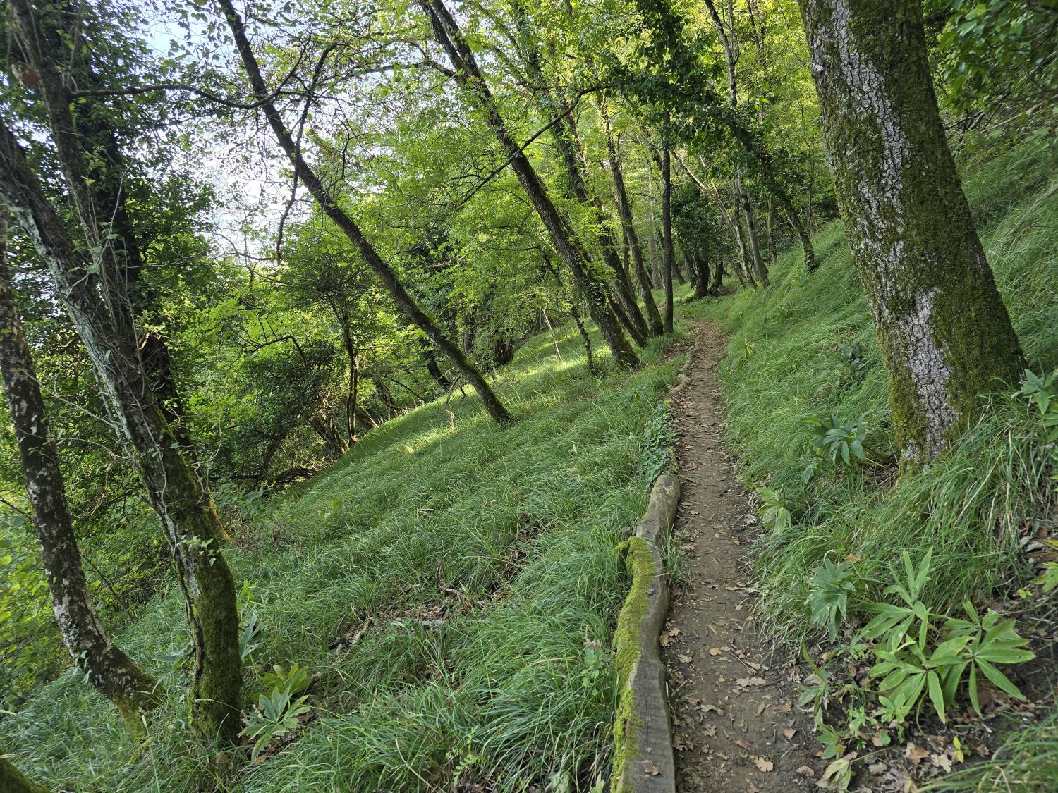 Tukaj prečkamo grapo in se začnemo vzpenjati po stezi, ki se v številnih ovinkih dviga do vodoravnega kolovoza, ki prereže pobočje Poljan. Prečkamo ga in nadaljujemo na trenutke precej strmo navzgor. Celoten vzpon iz grape je v mokrem zaradi blata spolzek in zahteva previdnost.