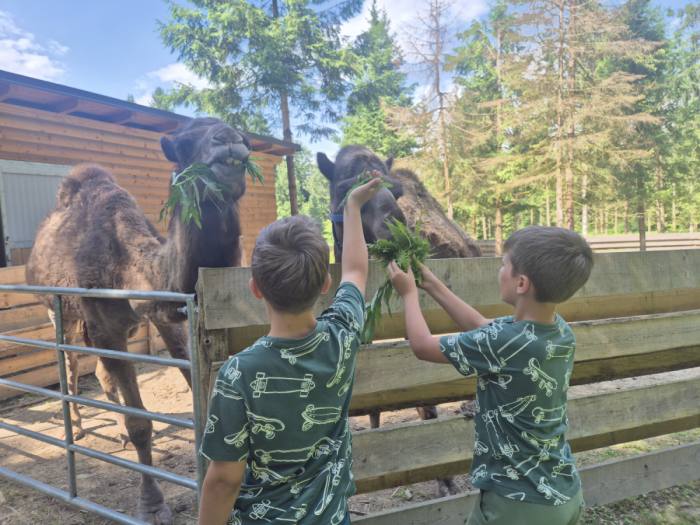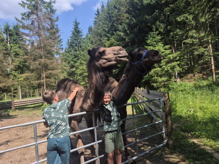 Kamele so zelo mogočne in izredno prijazne živali, iskrene in obožujejo ljudi. Prav uživali sta v božanju in crkljanju. Tudi one imajo super energijo, s katero te pomirijo, čas ob njih se kar ustavi.