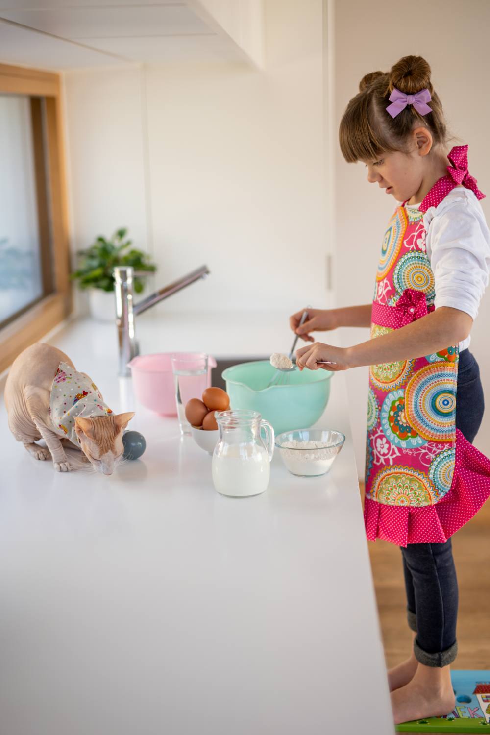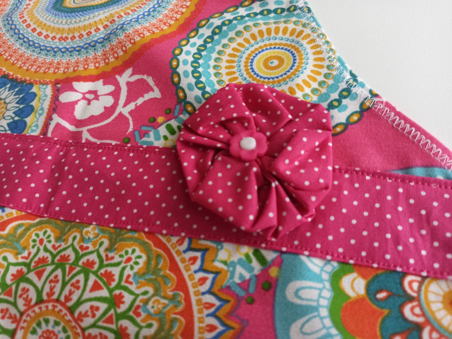 Predpasnik je narejen izpod natančnih rok šivilje Anje iz Timilujeve ustvarjalnice. Simpatični detajli pike, volančki in rožice pa so le pika na i na predpasniku in naredijo male kuharice modne tudi v kuhinji;)