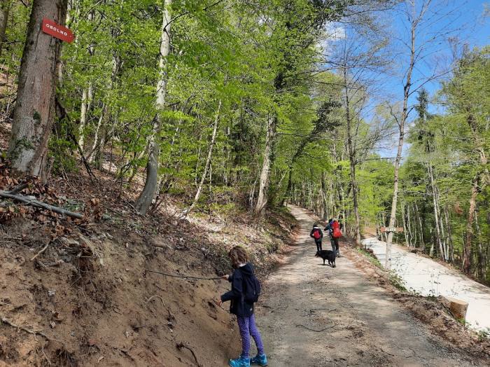 Ko prispemo do kolovoza, opazimo naslednjo markacijo, kolovoz pa nas popelje na razgledno pobočje, kjer se ob levem robu najprej še da slediti nekakšni stezi, ki pa se kmalu izgubi.