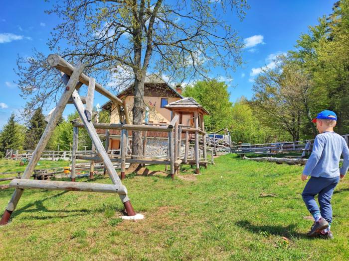 Na vrhu je velik travnik in igrala (nekatere so še v izdelavi), pod kočo pa se nahaja poligon, ki popestri otroško razigranost.